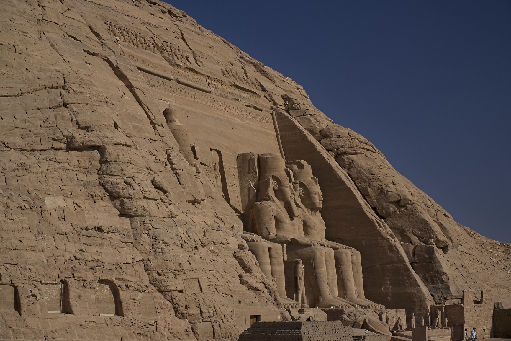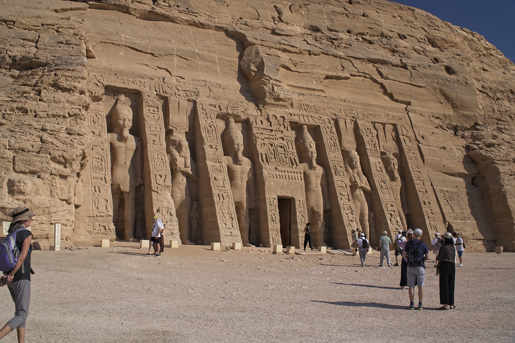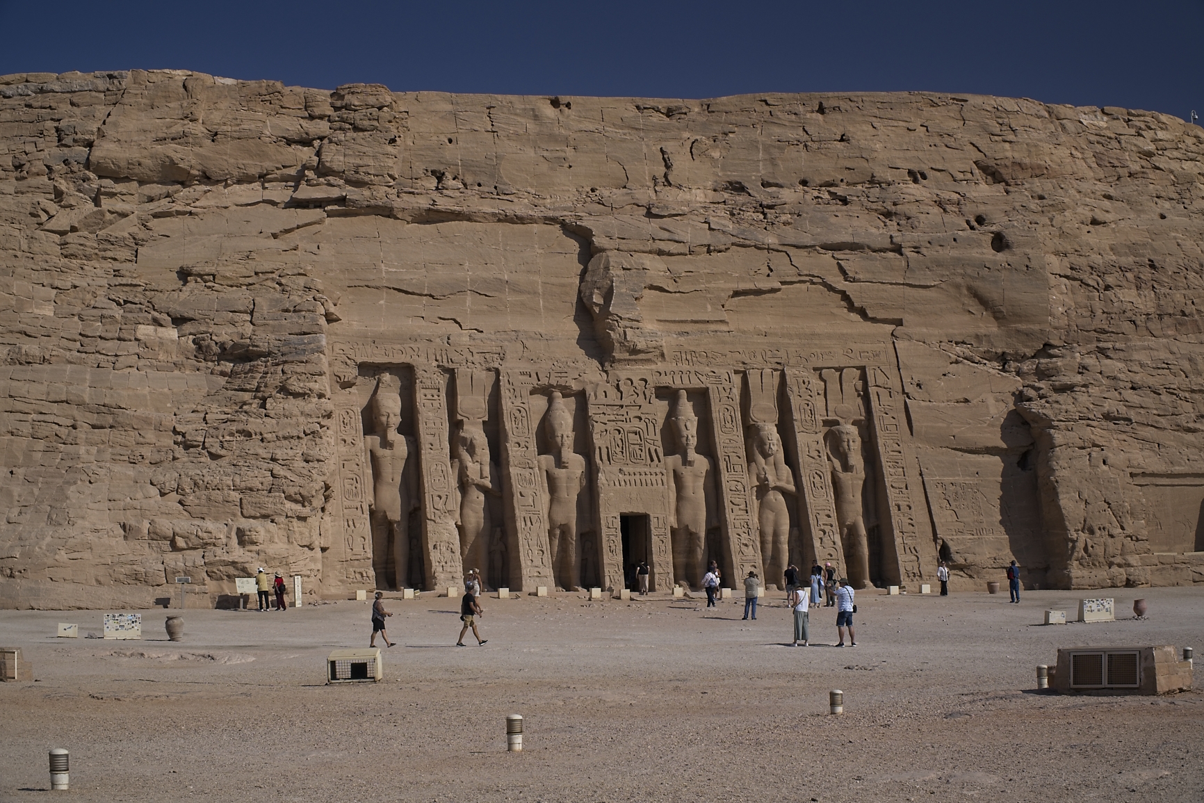 Another rock-cut temple to the north, known as the Small Temple, is dedicated to the goddess Hathor and Ramesses II’s Great Royal Wife, Queen Nefertari. On the façade of the Small Temple, her colossi are the same size as those of her husband, a very rare example of such display.