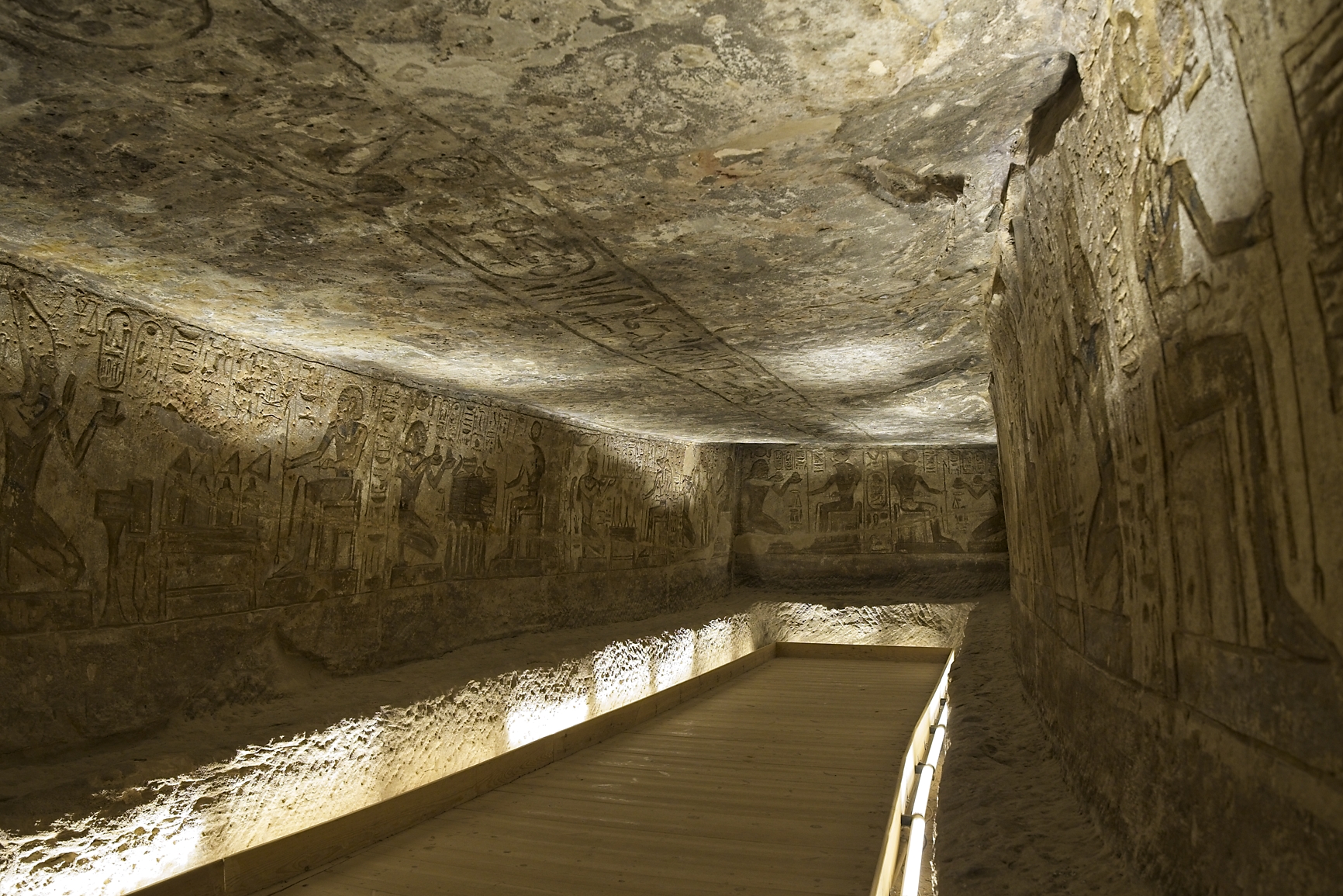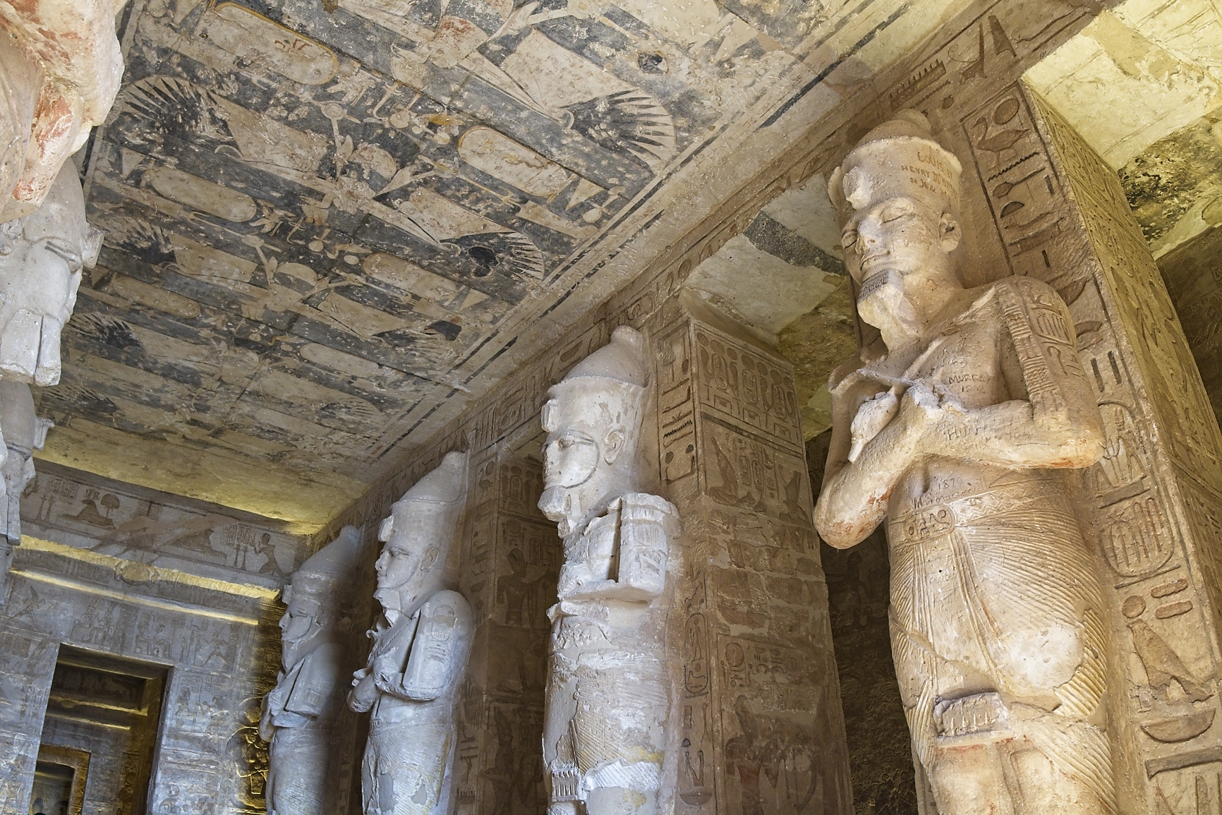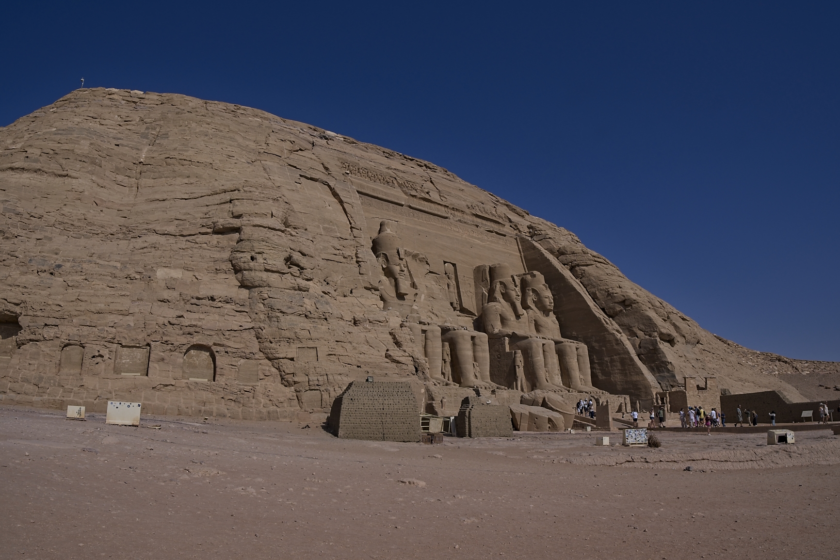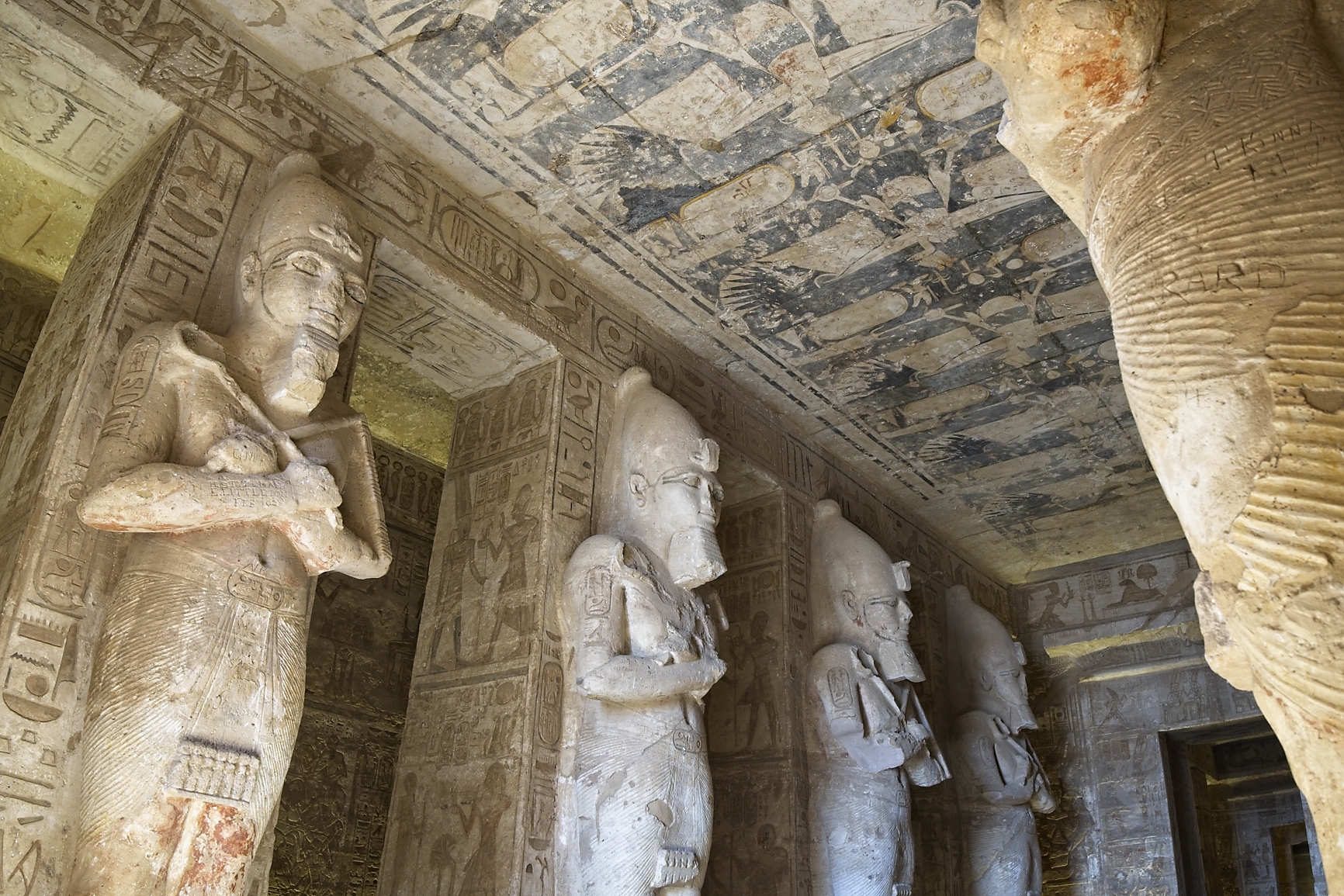 Another rock-cut temple to the north, known as the Small Temple, is dedicated to the goddess Hathor and Ramesses II’s Great Royal Wife, Queen Nefertari. On the façade of the Small Temple, her colossi are the same size as those of her husband, a very rare example of such display.