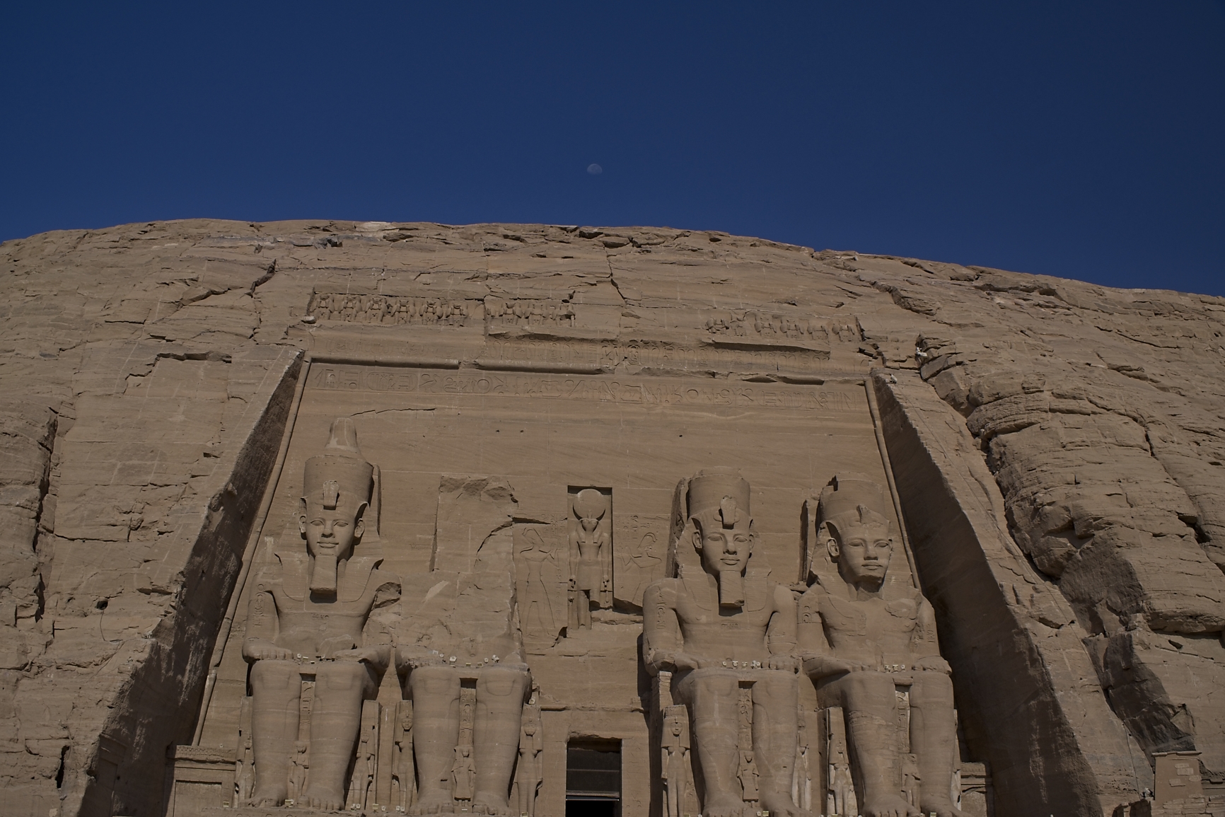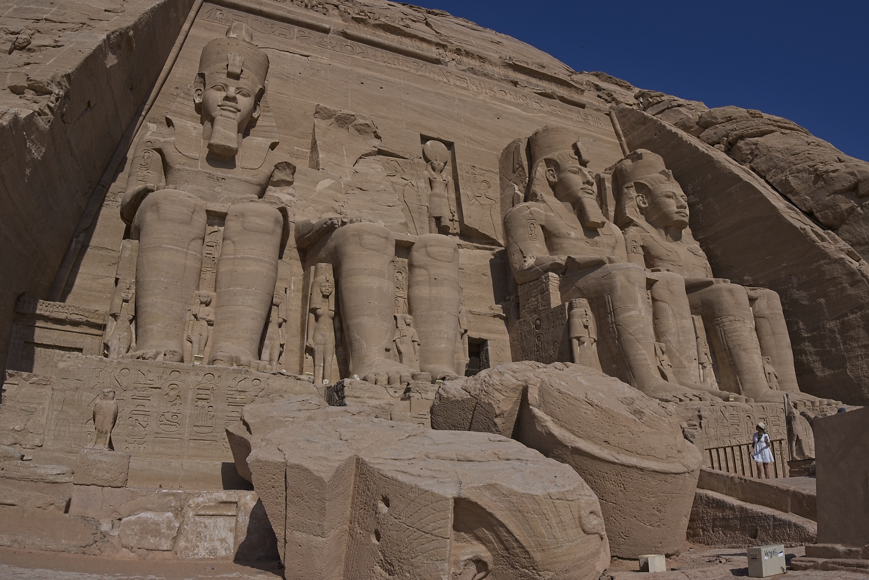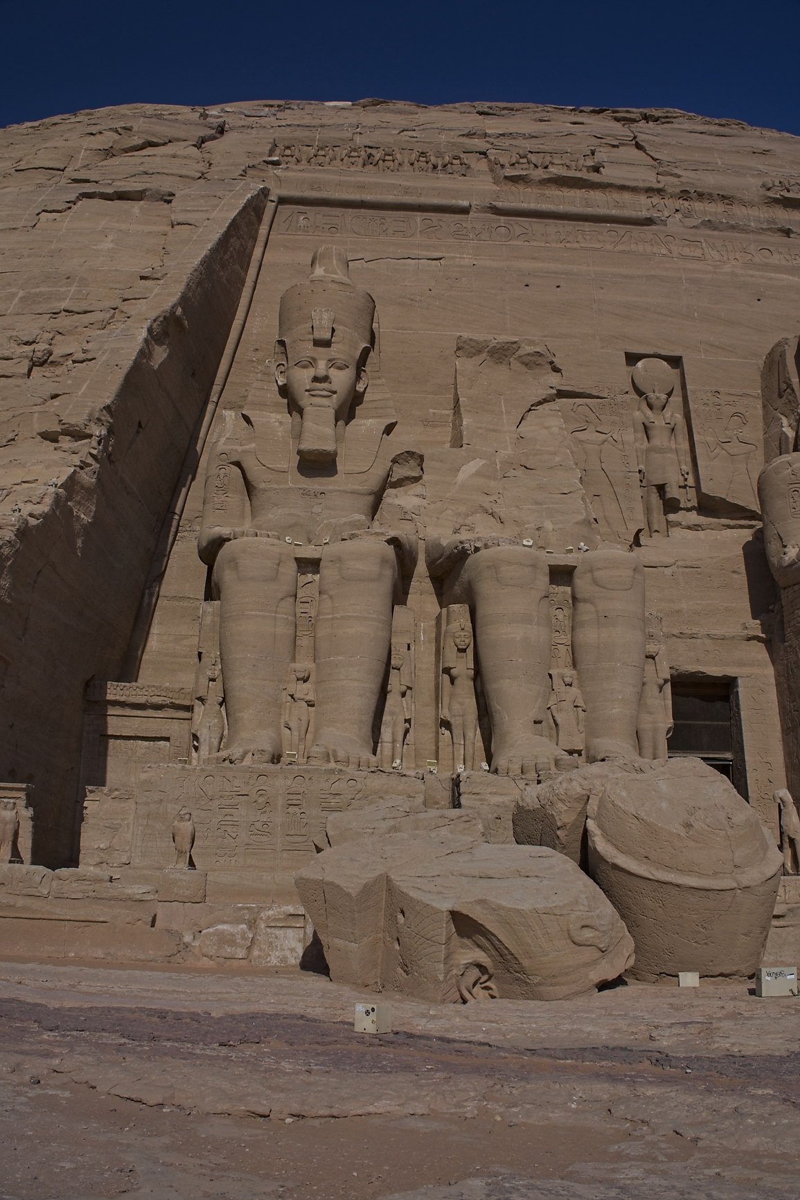 Today we will be spending a lot of time in the bus, it is quite a way to visit Abu Simbel, but it was worth the ride. The Great Temple of Abu Simbel, in Nubia near Egypt’s southern border, is amongst the most awe-inspiring monuments of Egypt. It was cut into the living rock by King Ramesses II (the Great) of the Nineteenth Dynasty, around 1264 BC. The temple is most well known for the four imposing seated colossal statues that dominate its façade. One of these collapsed because of an ancient earthquake, and its fragments can still be seen on the ground.