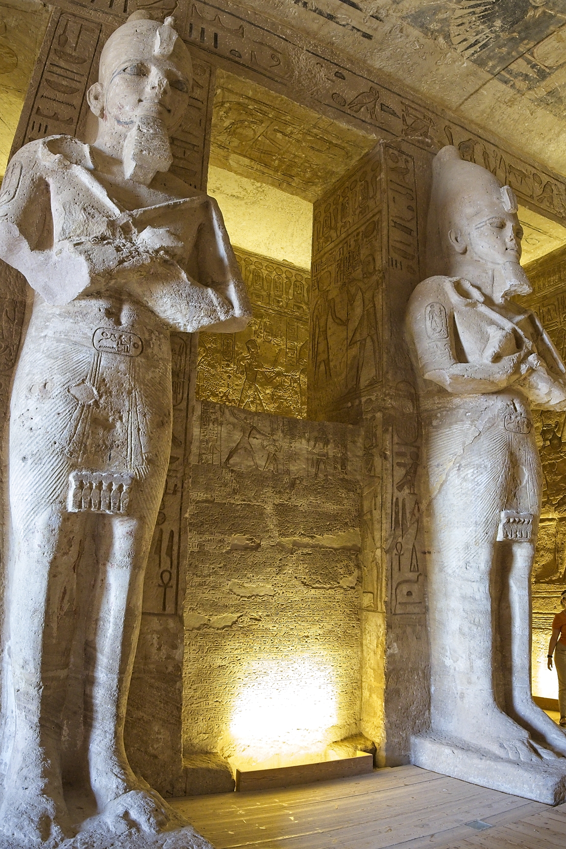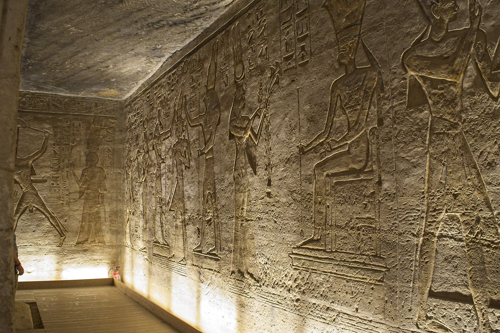 Colossal standing statues of the king line the main hall, leading to the sanctuary where four deities are sat: Amun Ra, Ra Horakhty, Ptah, and a deified version of Ramesses II. The temple was built with such precision that on two days a year, the 22nd of February and 22nd of October, the sun’s rays enter the temple, cross the main hall, and illuminate the innermost statues.